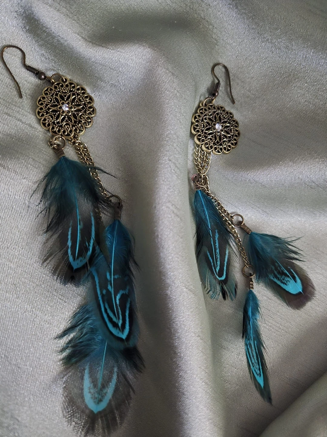 These are really pretty feather dangle earrings. They have a bohemian style and are perfect for adding a unique touch to any outfit. The earrings feature a delicate filigree design with blue and brown feathers. Brand new