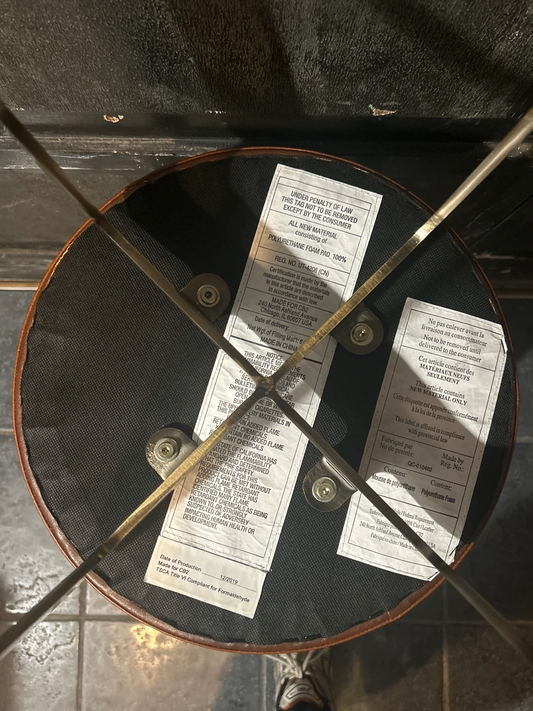 Construction: Frame:steel brass powder coated with high gloss lacquer buffalo leather -brown - non fr foam. Seat height is 30" to sit at bar height table.