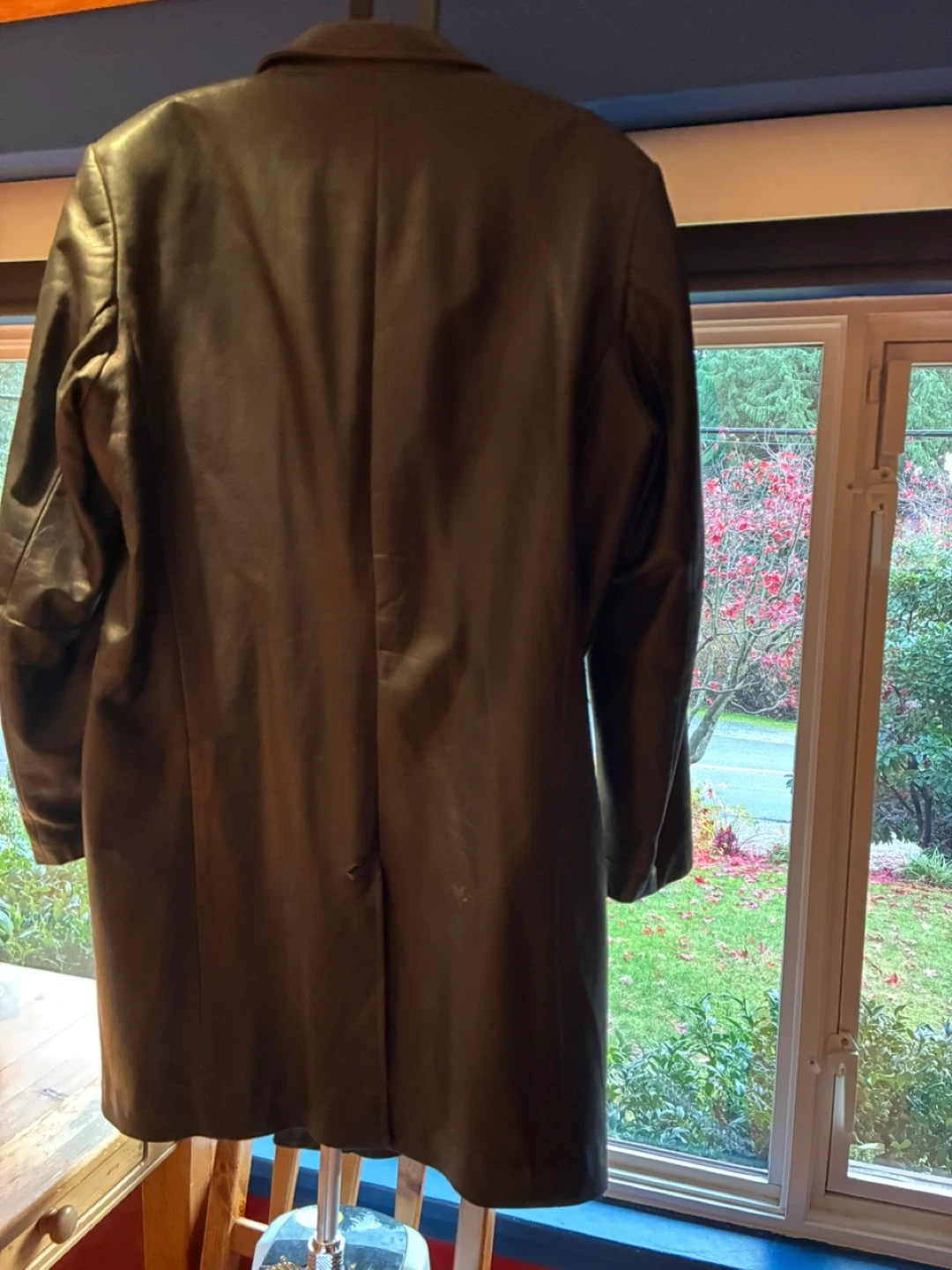 Selling a Danier leather coat. Trench coat style. Side pockets outside. With breast pockets inside. It's a stylish and classic piece that would be a great addition to your wardrobe. It's in good condition, with a timeless design.