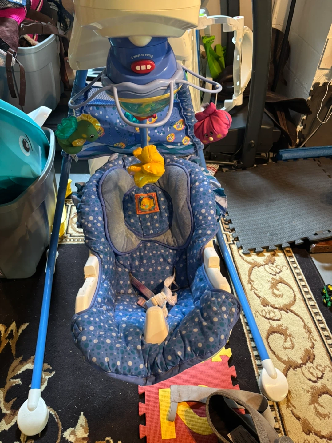 Selling a Fisher-Price baby swing in good condition! It's blue with a polka dot pattern and includes hanging toys. Perfect for keeping your little one entertained and comfy.