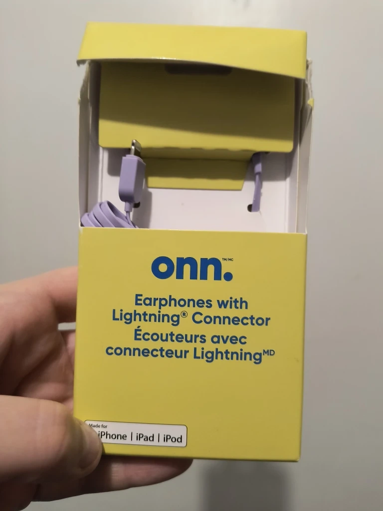 Selling a brand new pair of onn iPhone earphones. I bought the wrong ones and lost the receipt. These are brand new I didn't even take them fully out of the box because I realized it was the wrong pair lol