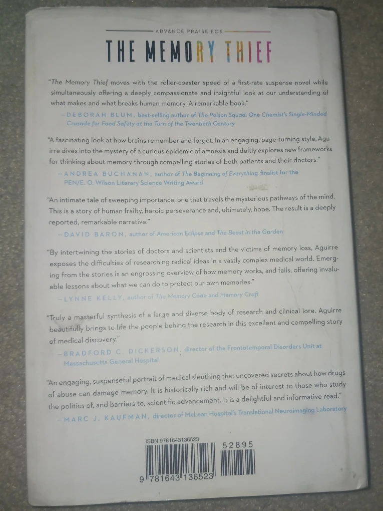 Selling "The Memory Thief and the Secrets Behind How We Remember" by Lauren Aguirre. It's a medical mystery book. A fascinating look into how brains remember and forget, exploring new frameworks for thinking about memory through compelling stories