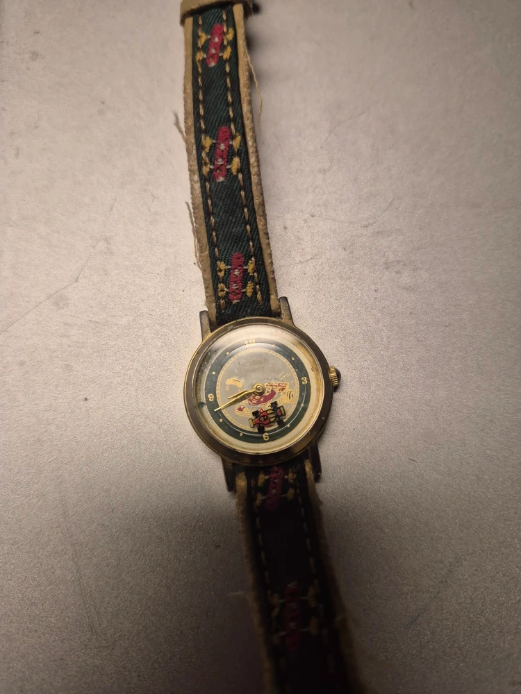 Selling a Technotech Quartz watch with a unique design! The strap features a pattern with red race cars. It's a fun and eye-catching piece for any watch collector