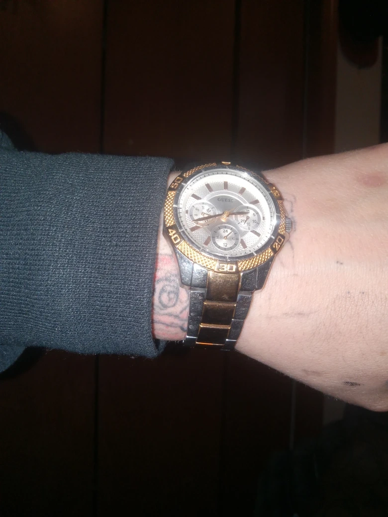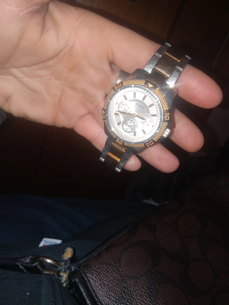 Selling a Guess two-tone chronograph watch. It features a silver dial with gold accents and a stainless steel band. The watch is in good condition and would make a great addition to any collection noextra links, does fit a little snug so recommended for dainty wrists