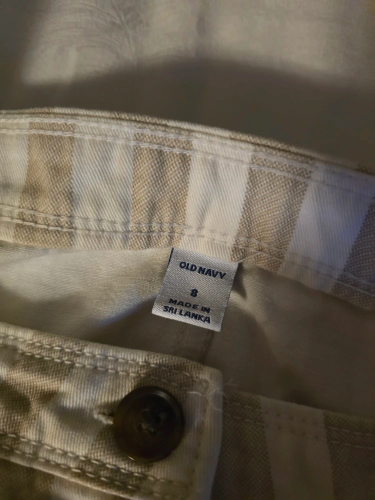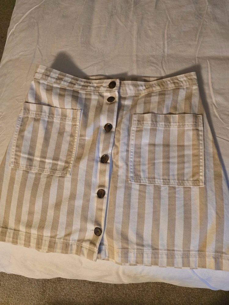 Selling a cute Old Navy skirt in size 8. It's a beige and white striped pattern with button details down the front and two front pockets! Perfect for a casual look.