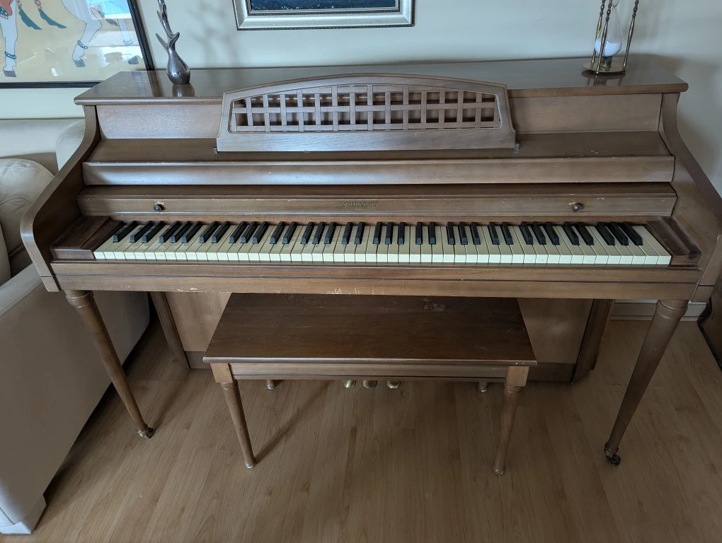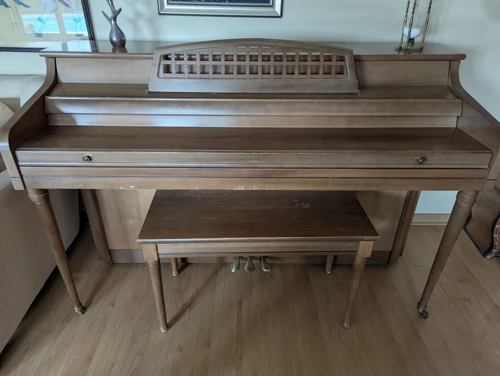 Selling a Whittemore upright piano with a matching bench. It's a lovely piece of furniture and a great instrument for any aspiring musician. It has a beautiful brown finish that would complement any home decor. Perfect for someone looking to start playing or upgrade their current instrument!