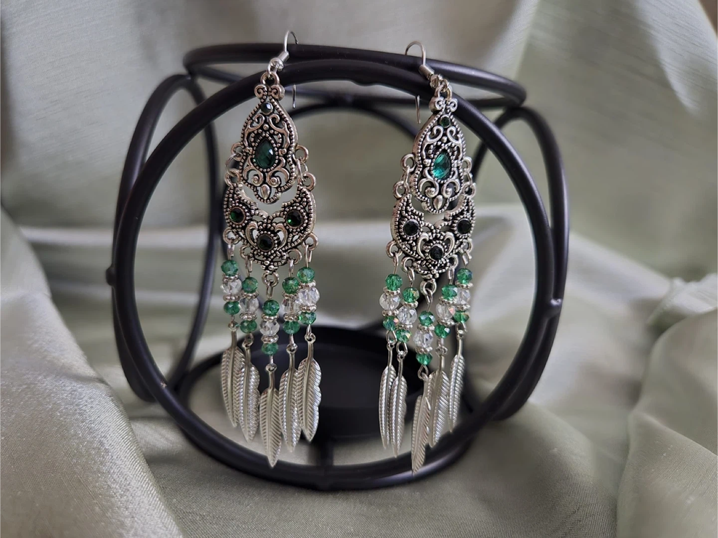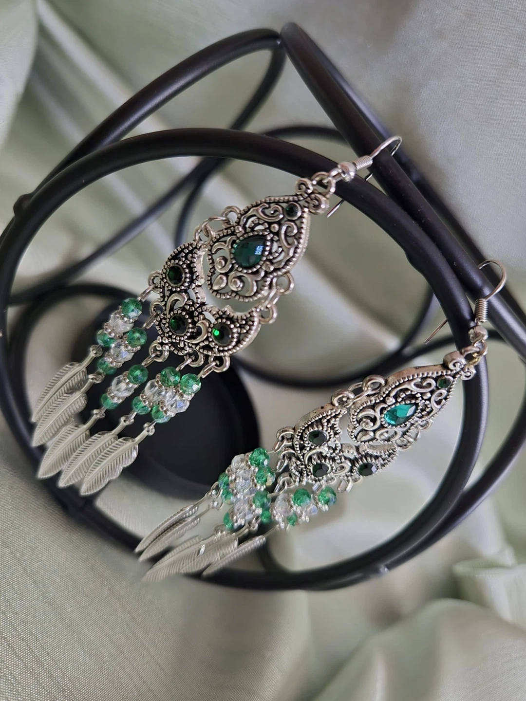 65These are a pair of beautiful green and silver dangle earrings. They feature intricate designs and shimmering accents, perfect for adding a touch of elegance to any outfit