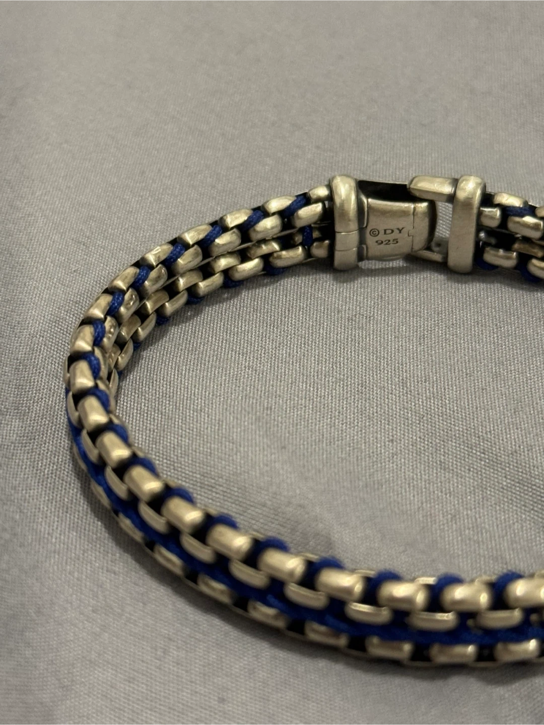 Selling a David Yurman Woven Box Chain Bracelet in sterling silver with blue nylon, 10mm. It comes with its original pouch. Originally bought for $900 CAD. Perfect condition!