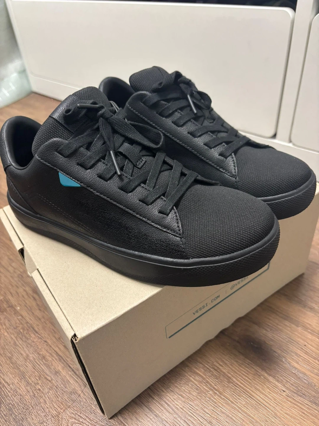 Selling a pair of Vessi Soho sneakers in women's size 6! These shoes are all-black, and the soles have a cool blue wave pattern. They're designed for comfort all day long. Comes with the original box!