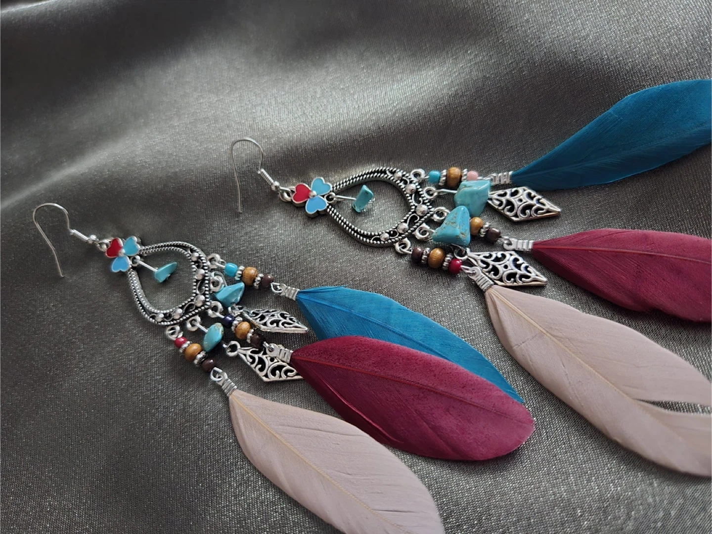 65These are a pair of beautiful feather dangle earrings. They have a boho style with silver-tone metal and colourful feathers in blue, burgundy, and beige. Brand new, would make a lovely addition to any outfit!