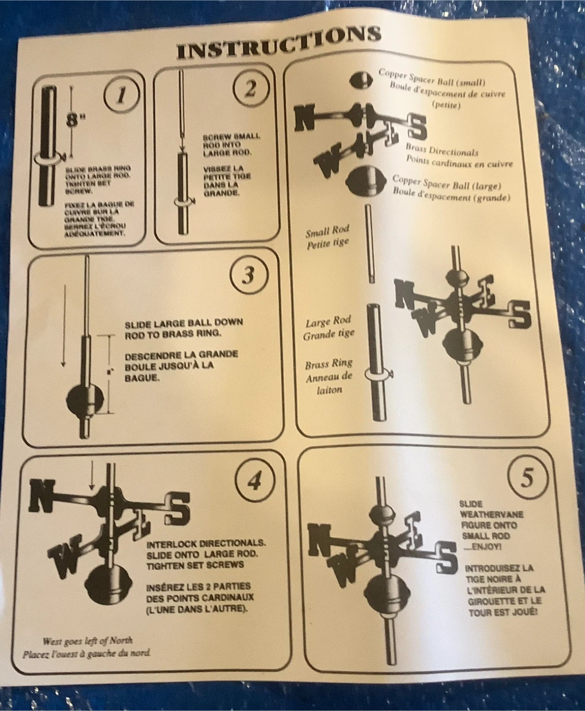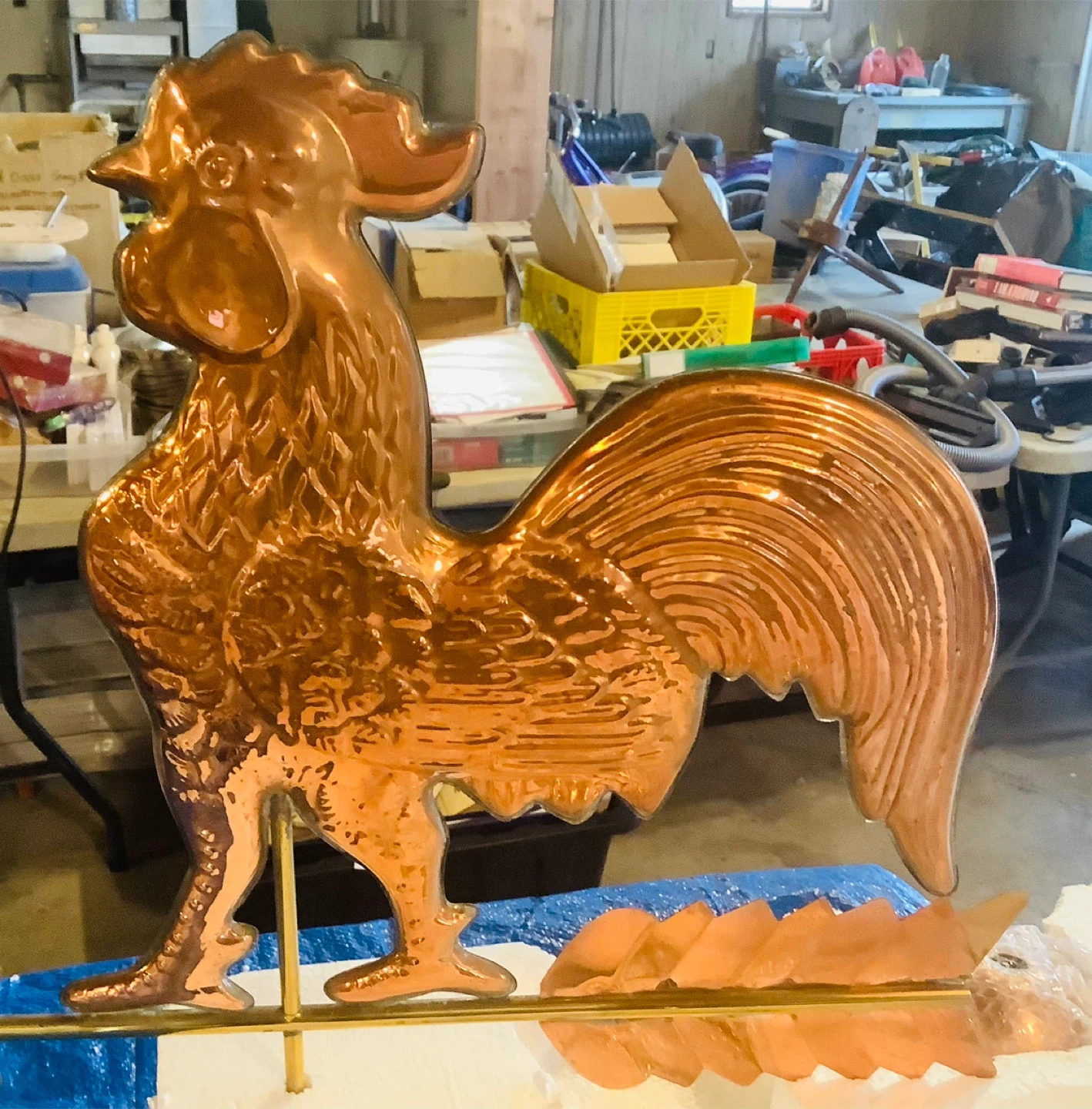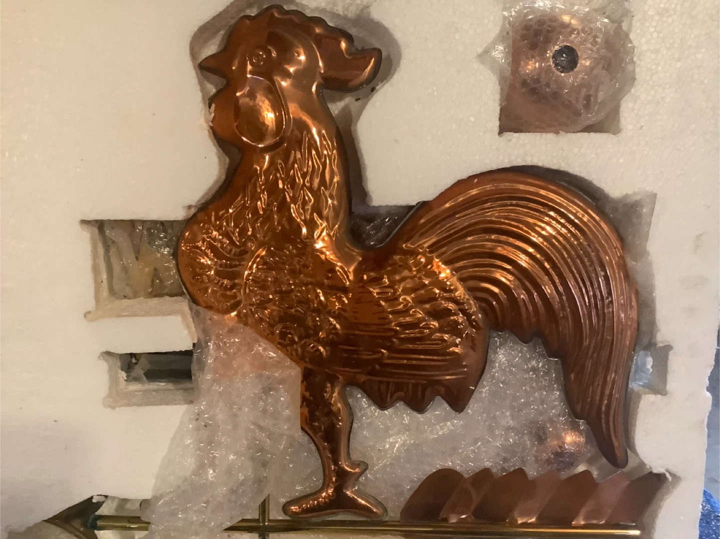 Selling a brand new copper rooster weathervane, still in its original box! It comes with all the necessary components for assembly, including the directional pieces and mounting rod. This weathervane is sure to add a touch of rustic charm to any home or garden