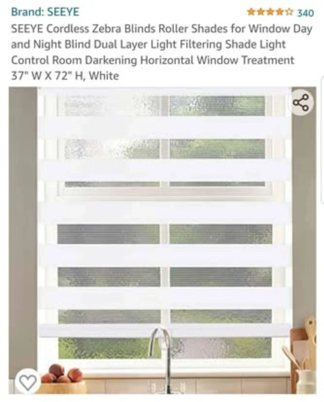 Selling a cordless zebra blind, sized 37" W x 72" H in white. It's brand new and still in its original packaging!
