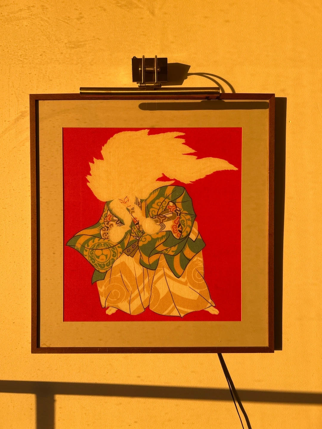 Selling a framed print featuring a Japanese Kabuki actor. The print has a striking red background with the actor in traditional costume. It's a unique piece of art that would add a touch of culture to any room. Was originally from a hotel in Kyoto.