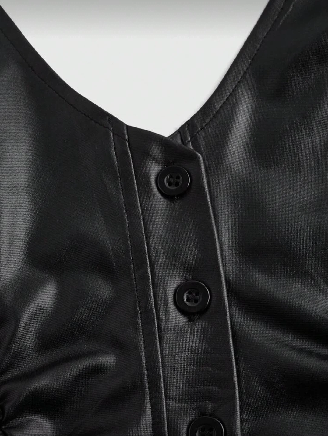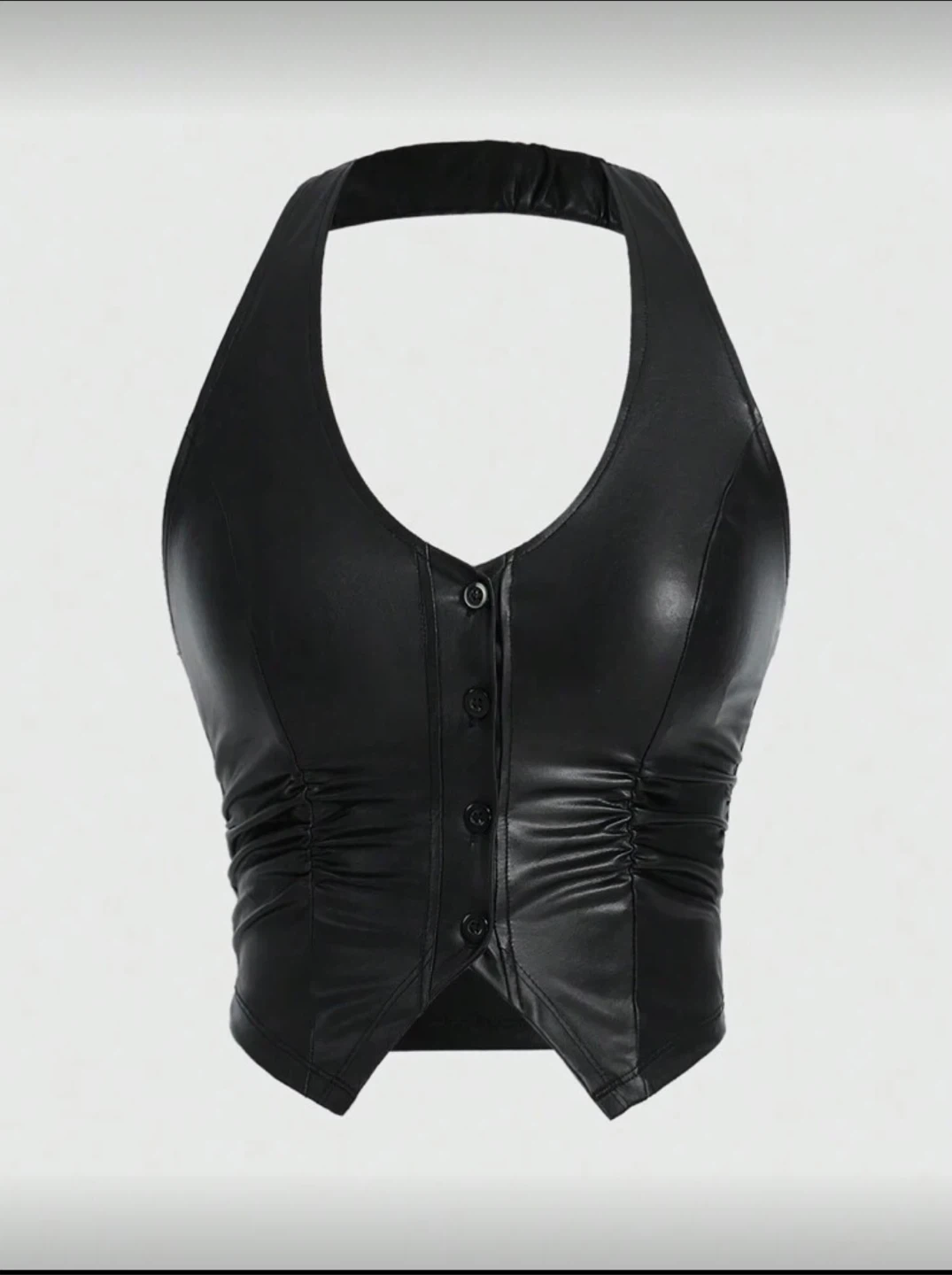 This is a stylish black faux leather halter top. It features a button-up front and ruching on the sides. Perfect for a night out or a trendy casual look!