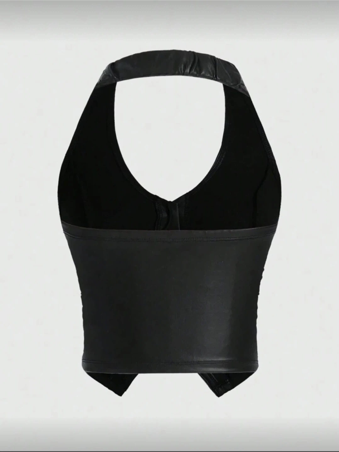 This is a stylish black faux leather halter top. It features a button-up front and ruching on the sides. Perfect for a night out or a trendy casual look!