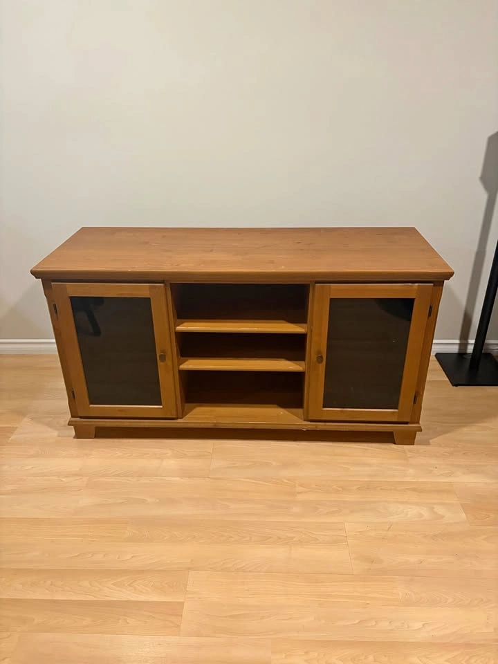Solid pine wood TV Stand. Very durable. Classic design with two glass-fronted doors and open shelving in the centre for media components. Originally appx $400 CAD. Used in very good condition. Solid pine makes this piece quite heavy. 2 people recommended for pickup.
