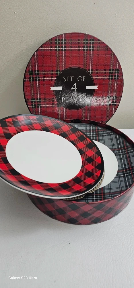 Selling a set of 4 assorted plaid plates! These plates come in a matching plaid box, perfect for storage or gifting. They would be a great addition to any kitchen or dining set