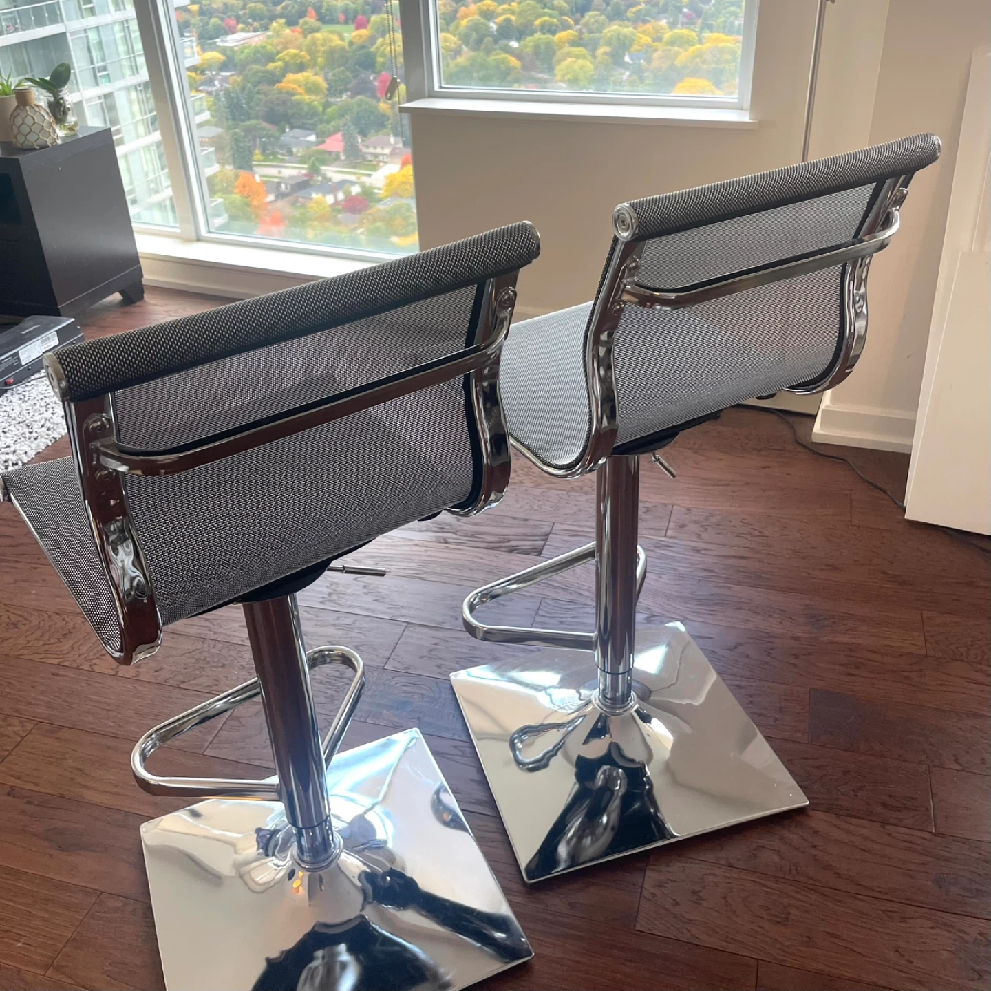 2 stylish bar stools with adjustable height. The seat height can be adjusted from 25.3" to 33.25". The overall height can be adjusted from 38.25" to 47". The base is 17" wide, and the seat is 15.5" from the floor. Perfect condition. Like new.