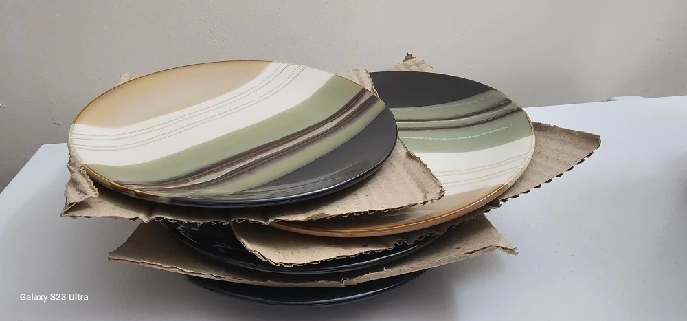 Selling a set of side or bread plates in good condition! They feature a unique striped design with earth tone colours. Perfect for adding a touch of style to your dining table!