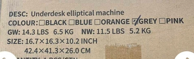 Stay active while you sit with this compact desk elliptical, designed for both exercise and rehabilitation. Featuring 12 adjustable speeds, it lets you customize your workout to fit your pace and goals. The included remote control allows effortless mode changes without bending down, keeping you comfortable during work or relaxation. Non-slip pedals ensure safety, while the smooth, quiet operation makes it perfect for home or office use. With its lightweight, portable build, this elliptical transforms any seated time into a chance for healthy movement. Color: Grey Model: ZF-0801 Dimensions: 18"D x 10"W x 17"H (45.72 x 25.4 x 43.18 cm) Stride Length: 2.54 cm Weight: 6.74 kg Resistance Type: Manual Resistance Levels: 12