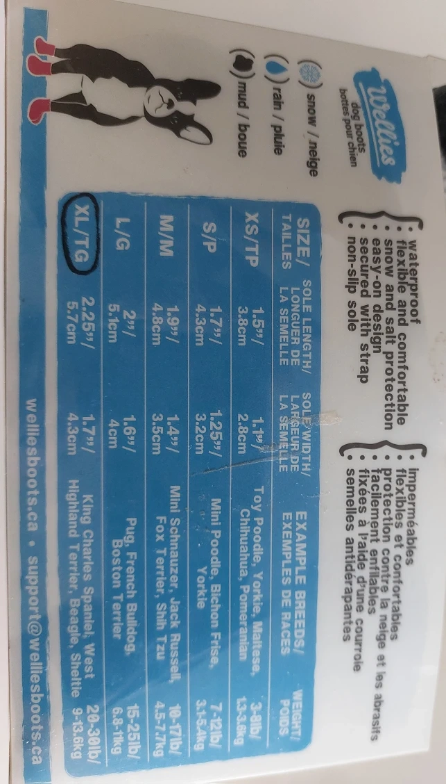 Keep your furry friend's paws protected with these Wellies dog boots! They're waterproof and comfortable, perfect for snow, rain, or mud. The easy-on design features a secure strap, and the non-slip sole ensures your dog's safety. These are size XL.