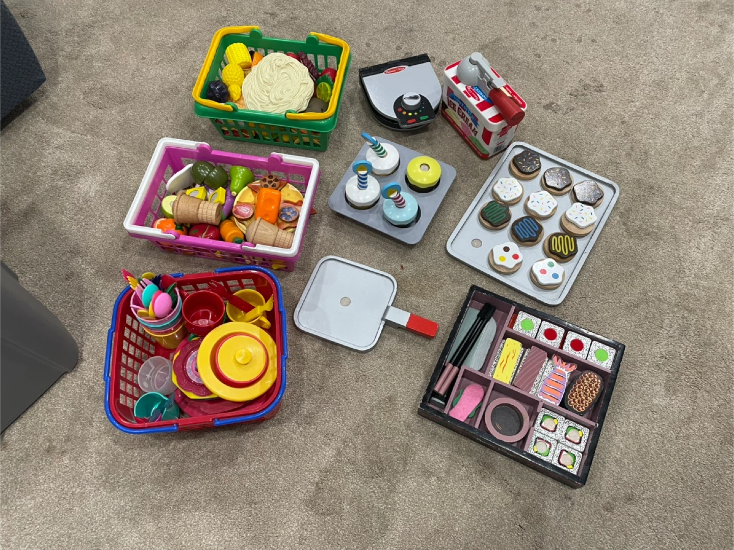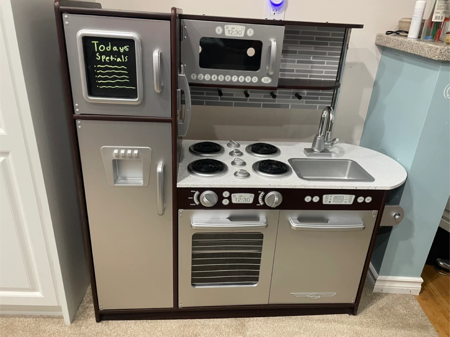 10This Play Kitchen comes with a refrigerator, oven, microwave, and sink, perfect for hours of imaginative play! It also includes various plastic and wooden food items, pots/pans, plates/cups and other accessories. Smoke-free home