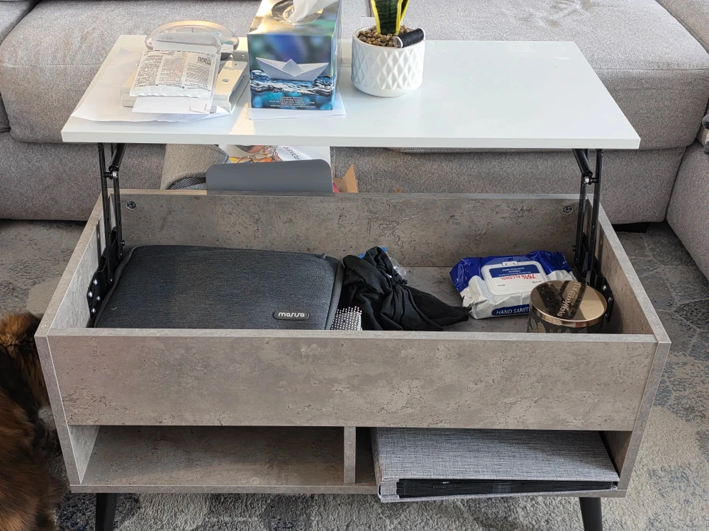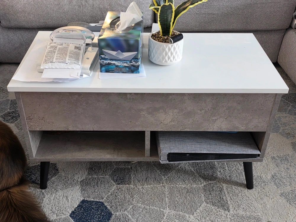 Selling a lift top coffee table! It's in great shape and has a handy lift-up top, perfect for working or snacking on the couch. There's also storage space underneath to keep things tidy