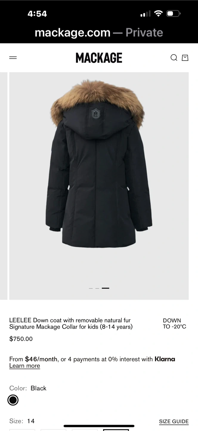 Selling a Mackage LEELEE down coat with a removable natural fur signature Mackage collar. It can fit a slim teen or adult .It's a kids size 14