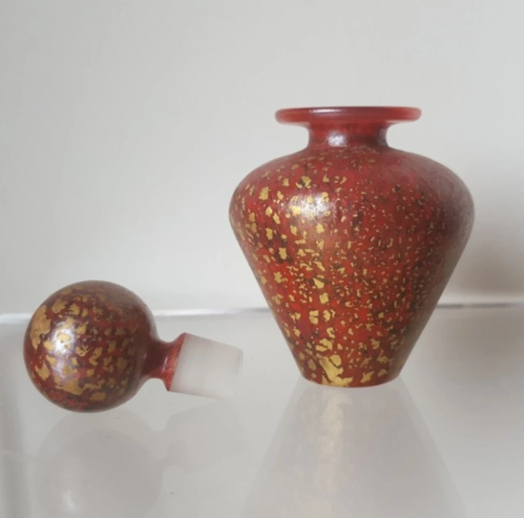 Here's a lovely Isle of Wight Glass perfume bottle! It features a unique design with a red and gold colour scheme, and stands at 9.5cm tall.