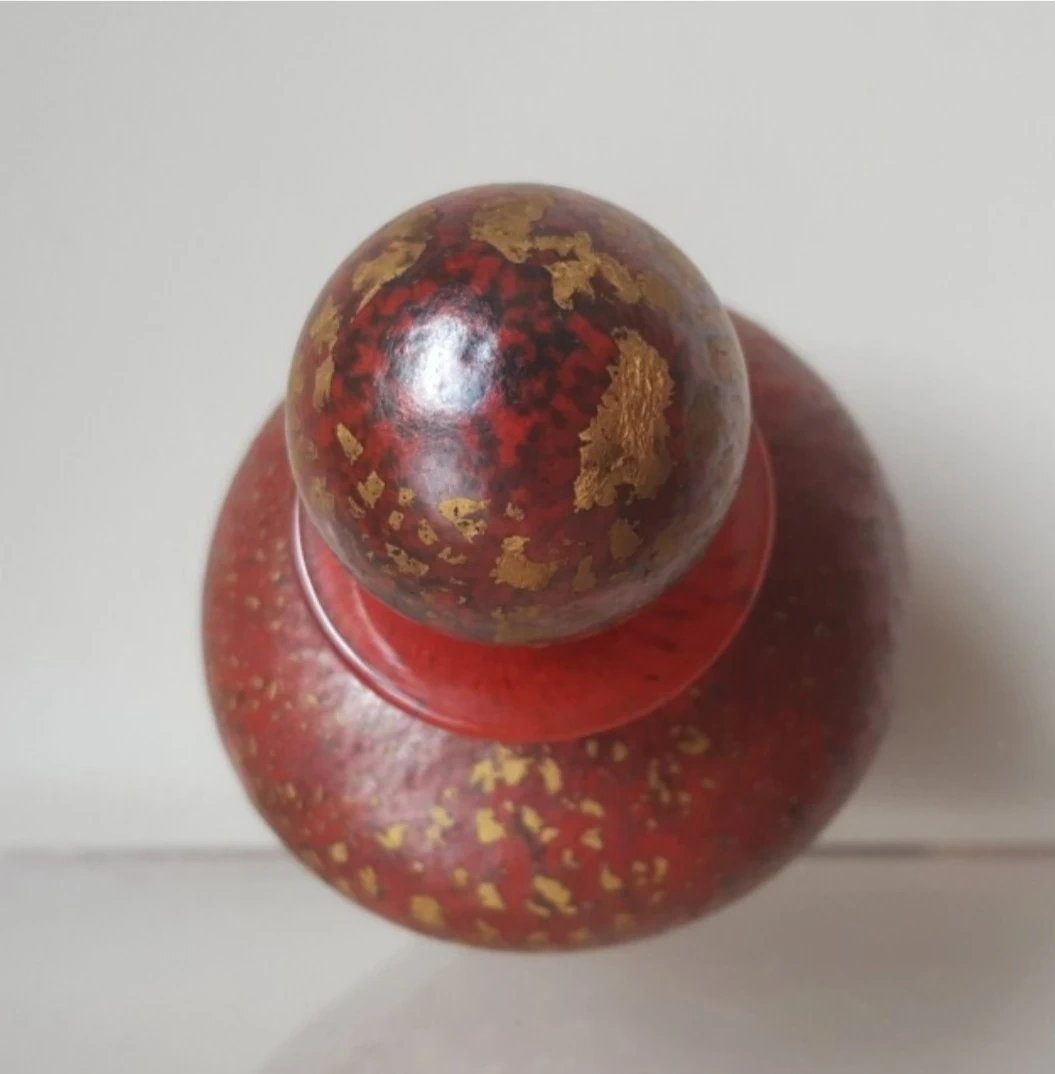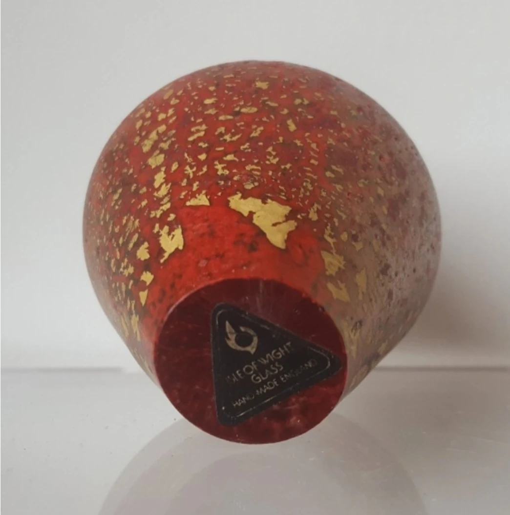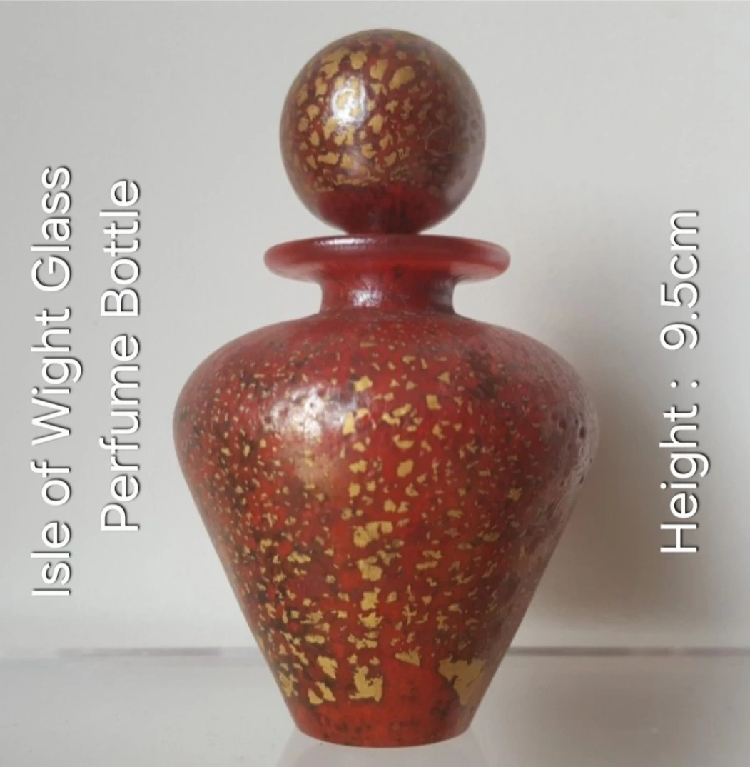 Here's a lovely Isle of Wight Glass perfume bottle! It features a unique design with a red and gold colour scheme, and stands at 9.5cm tall.