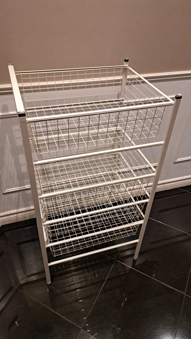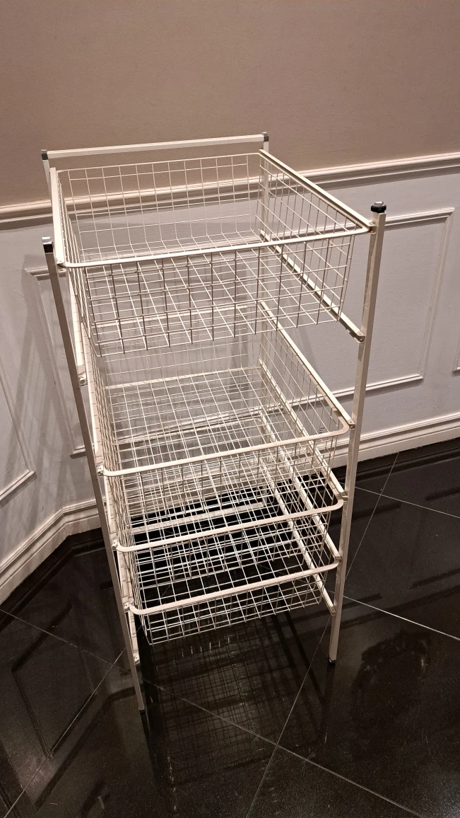 Selling a handy white metal wire basket storage unit! It's in great shape and perfect for organizing things around the house. The dimensions are approximately 17.5" wide, 21" deep, and 40" high