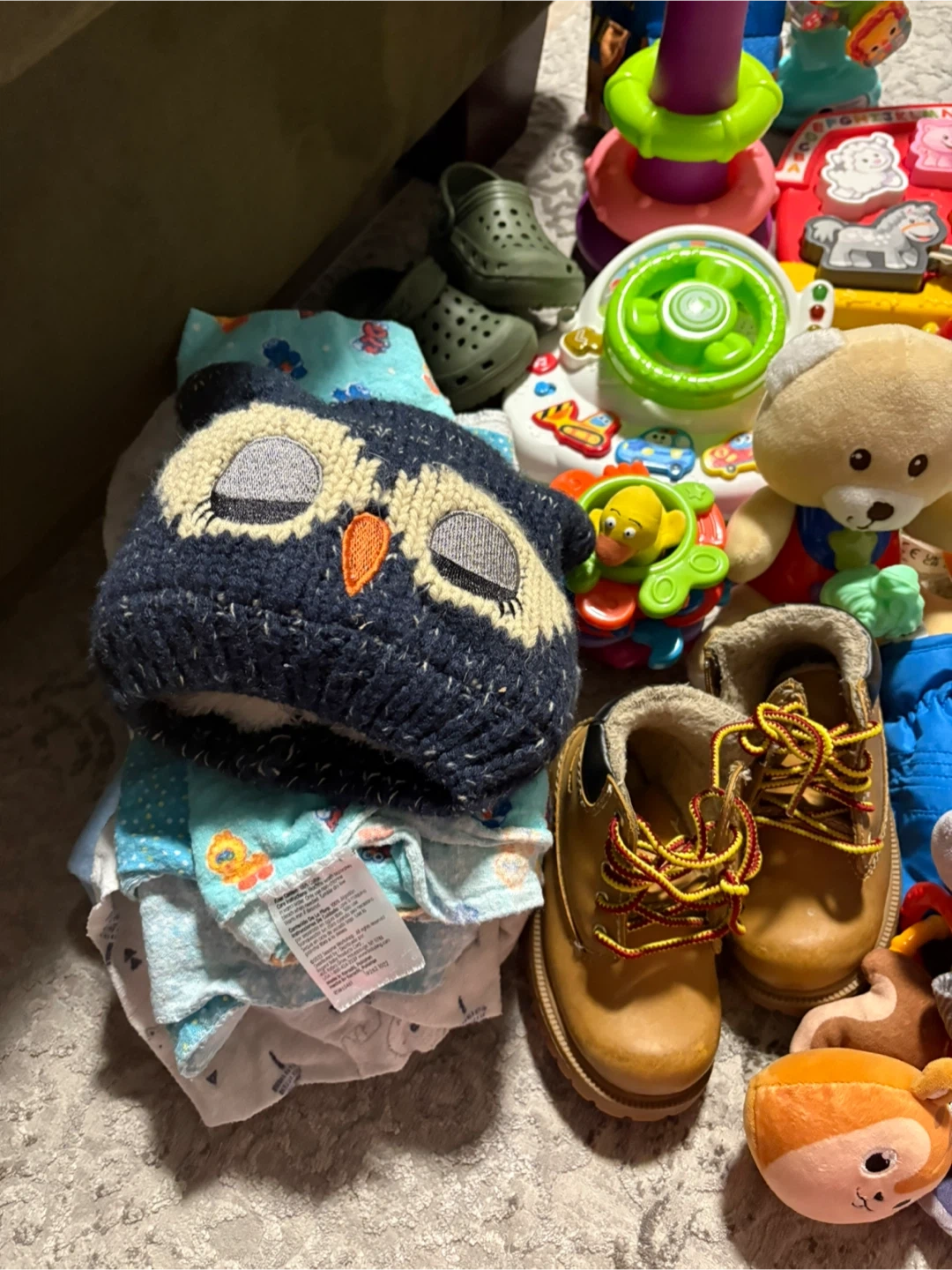 A mixed lot of baby and kids toys, including plush toys, interactive toys, and shoes! A lot of toys- shoes/ hats/ activity cube/ sitting and standing pillow - 30$ for the lot or items can be selected