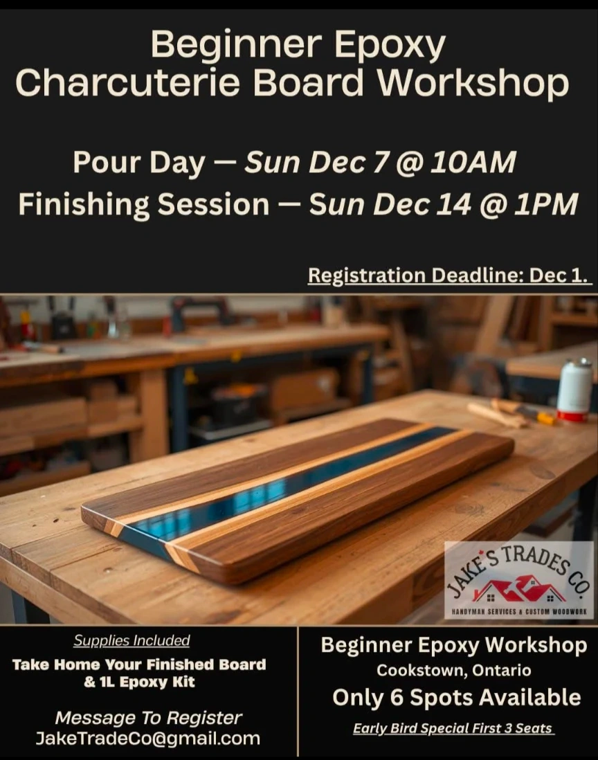 Registration is officially open for the Walnut & Epoxy Charcuterie Board Workshop in Cookstown, Ontario!