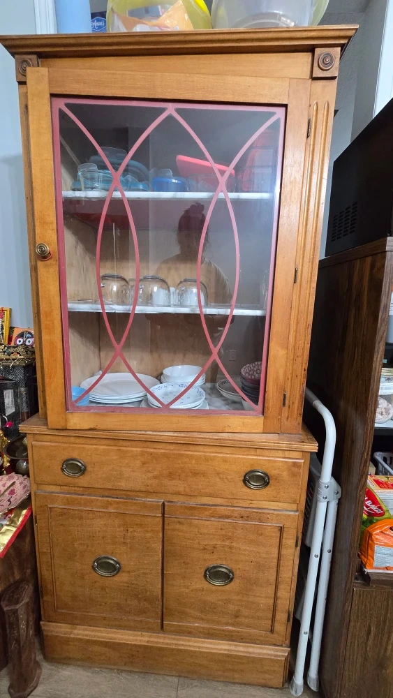 Selling a wooden ccabinet. It has a glass-fronted upper section with shelves, drawers, and a lower cabinet for storage. Perfect for displaying your favourite dishes and glassware!