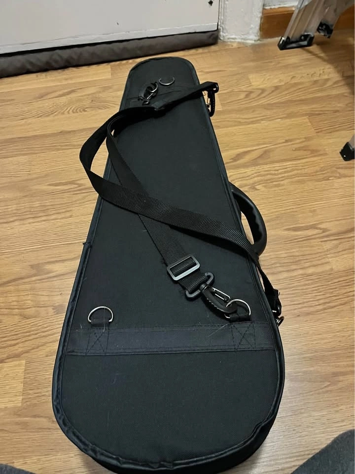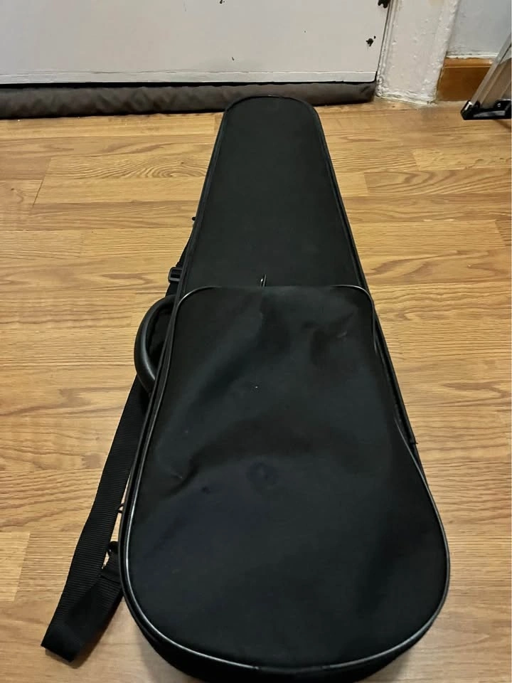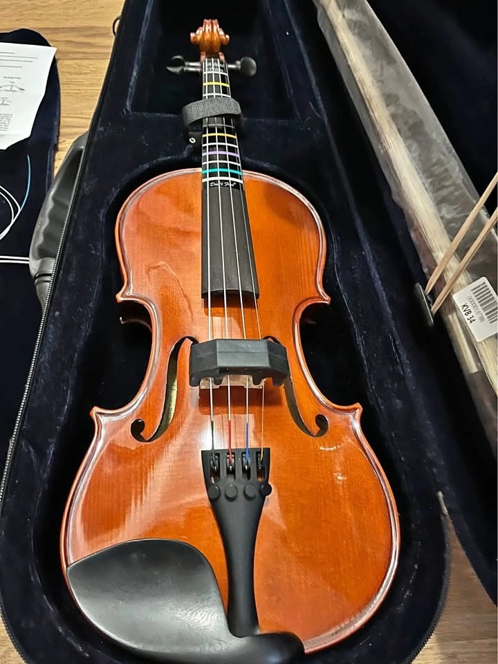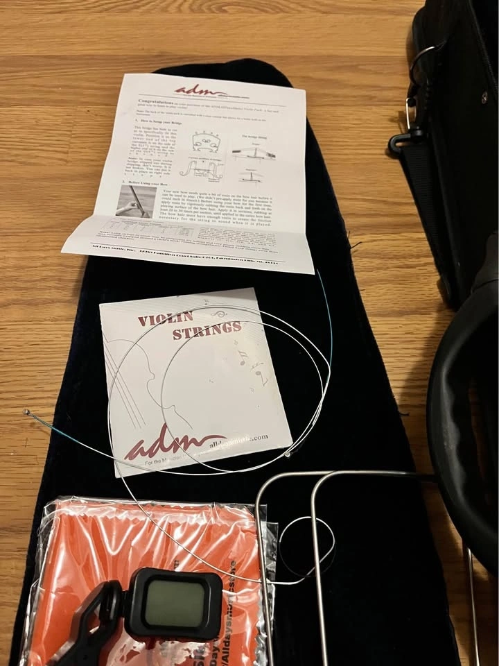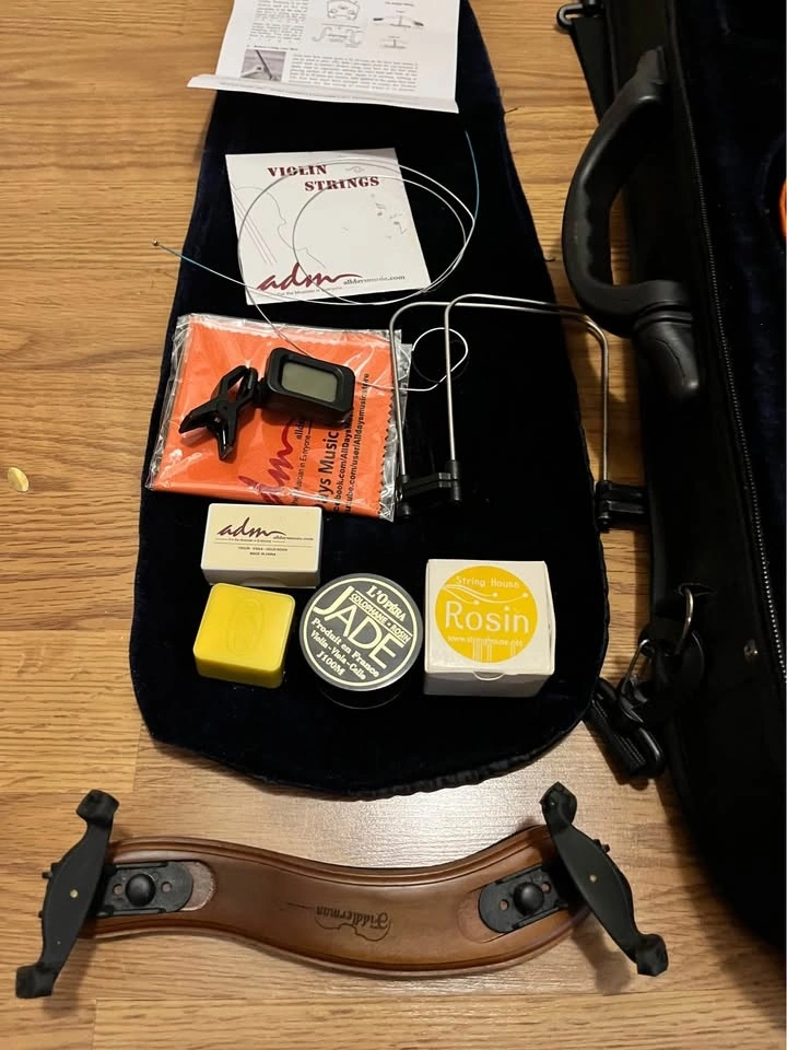 Used for a only a few practice sessions. Issue: the bag is missing a piece—seen in photo. Otherwise violin is in great condition plus all the goodies in photo included