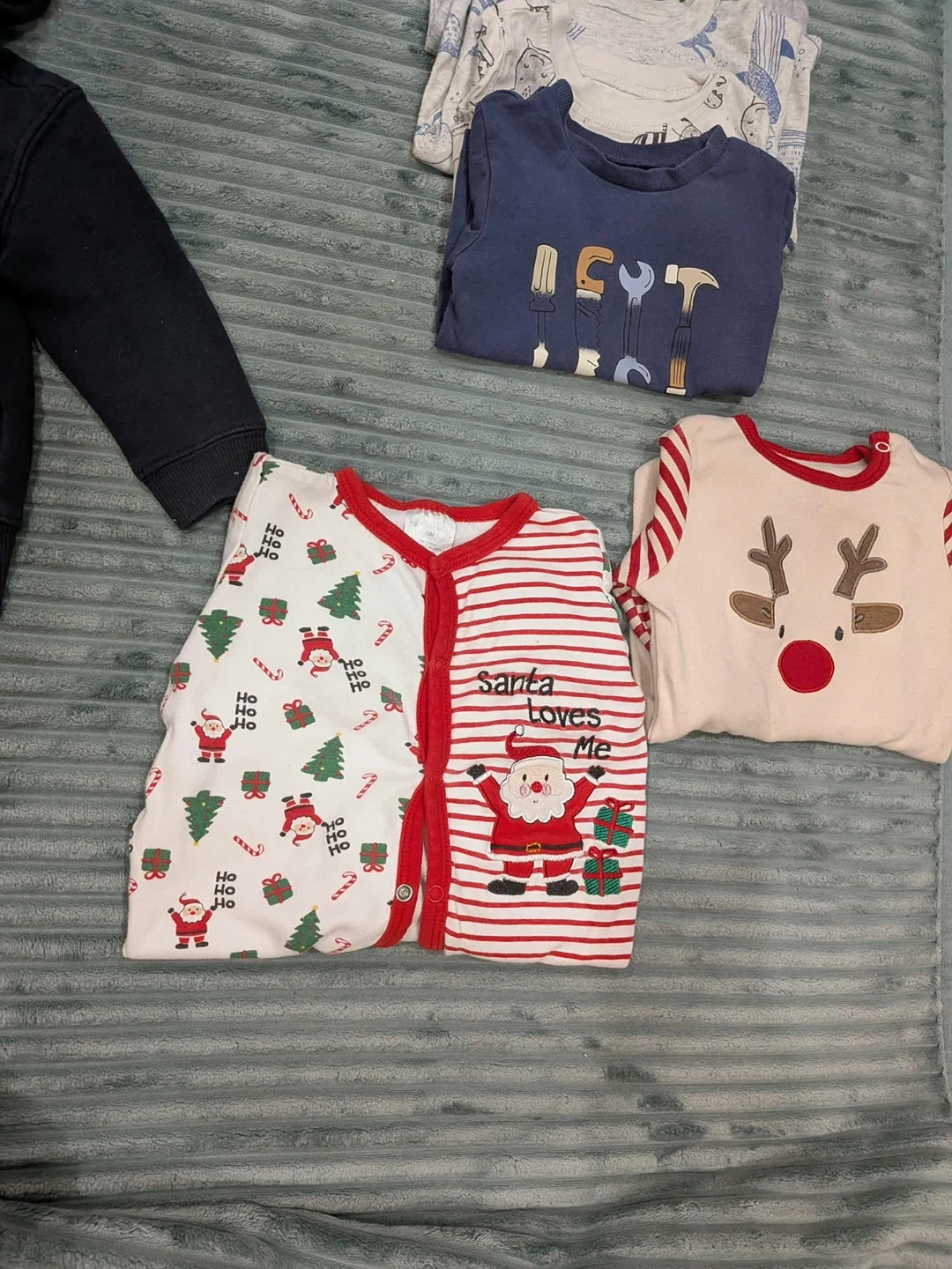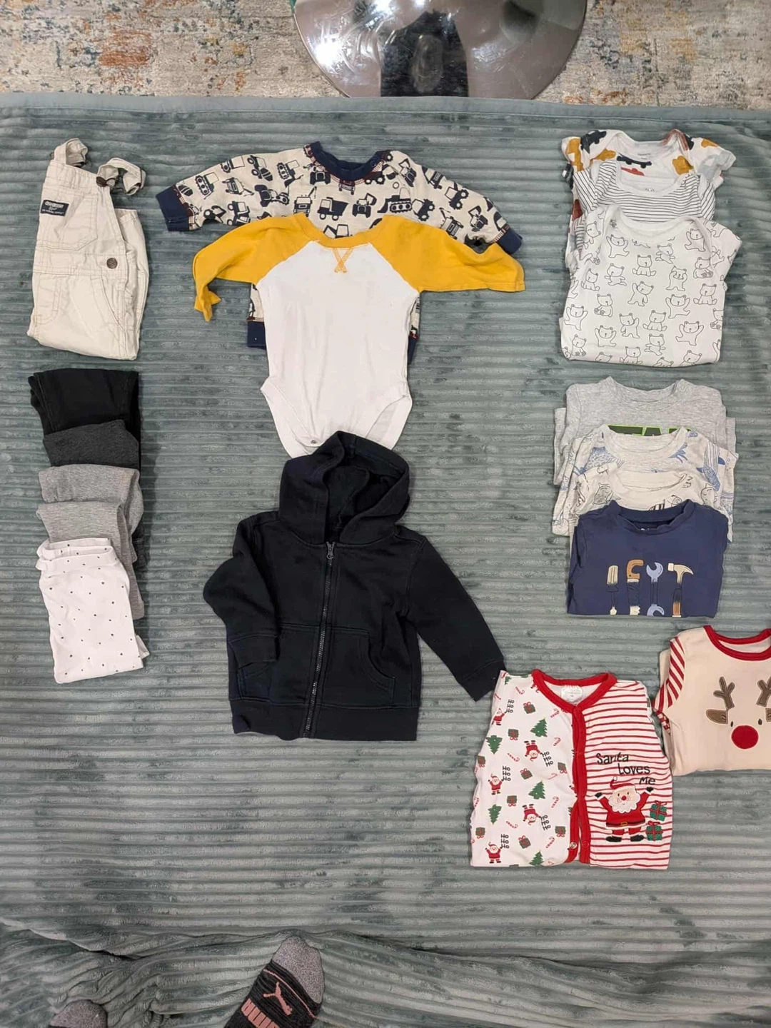 Selling a bundle of gently used baby clothes! Includes a variety of items like onesies, shirts, pants, and a hoodie. Great for stocking up on essentials for your little one