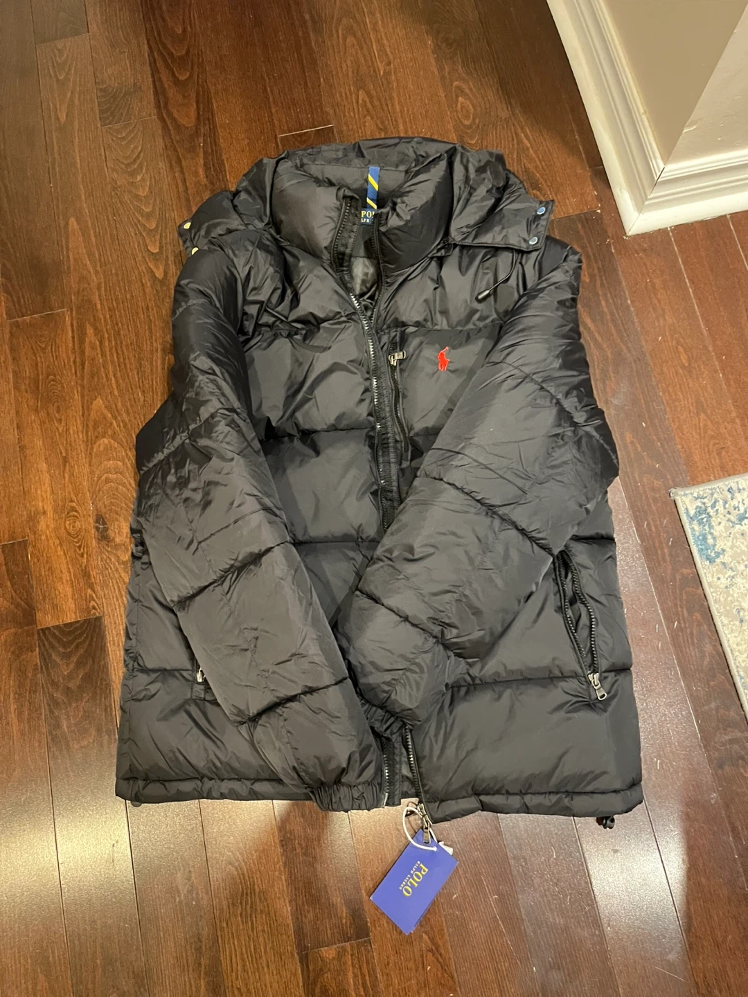 I'm selling a Polo Ralph Lauren puffer jacket in black. It's in great condition and perfect for staying warm this winter! The jacket features a red Polo logo. It's made of a durable material and has a comfortable fit
