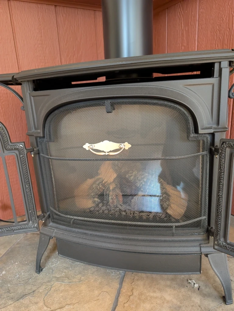 Selling a black cast iron wood burning stove. It's in good condition and ready to heat your home this winter! The stove features a mesh screen and doors.