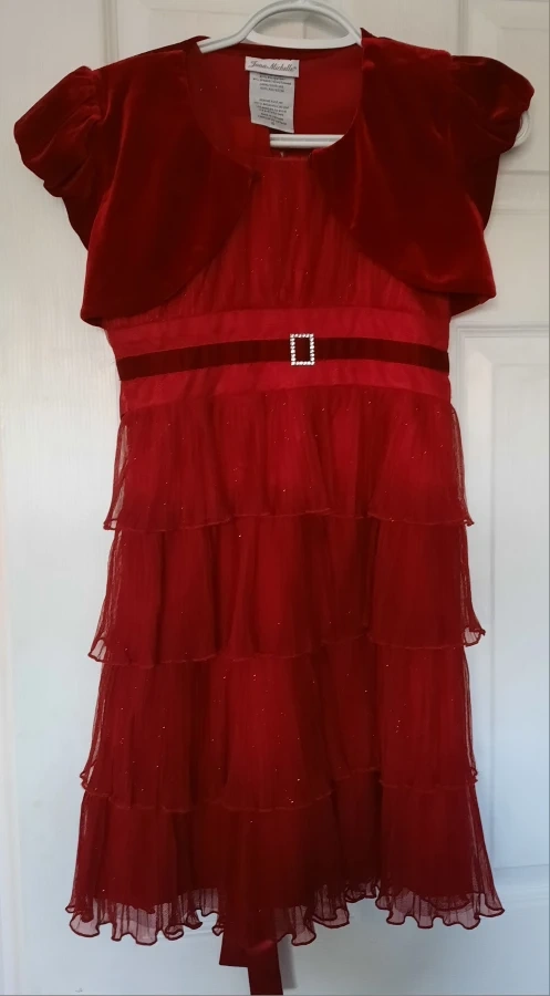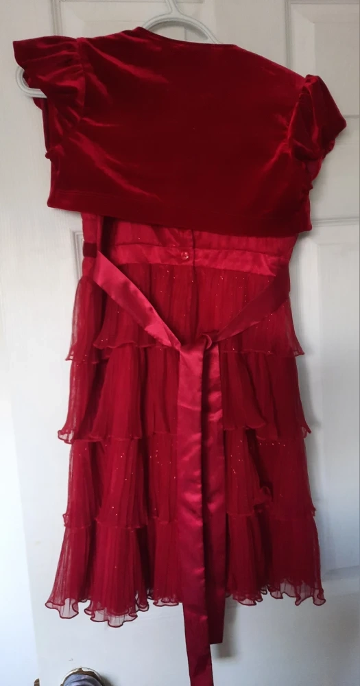 A beautiful red dress and bolero set from Jona Michelle! The dress is a size 10 and features a layered tulle skirt with a velvet-like waistband and a decorative buckle. The bolero is made of a matching velvet-like material, perfect for layering. The dress is made of 92% polyester and 8% spandex, with a 100% polyester lining