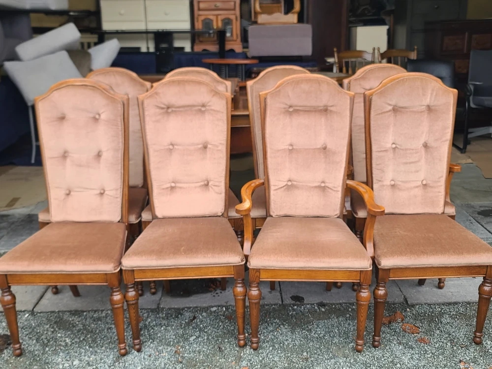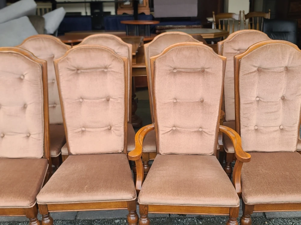 Dining table set that includes a table and eight chairs. The chairs are upholstered with a light brown fabric and have wooden frames. The table has a unique wooden design. Great for a dining room or kitchen! Measurements to follow. Delivery can be arranged. Viewing and pickup by appointment.