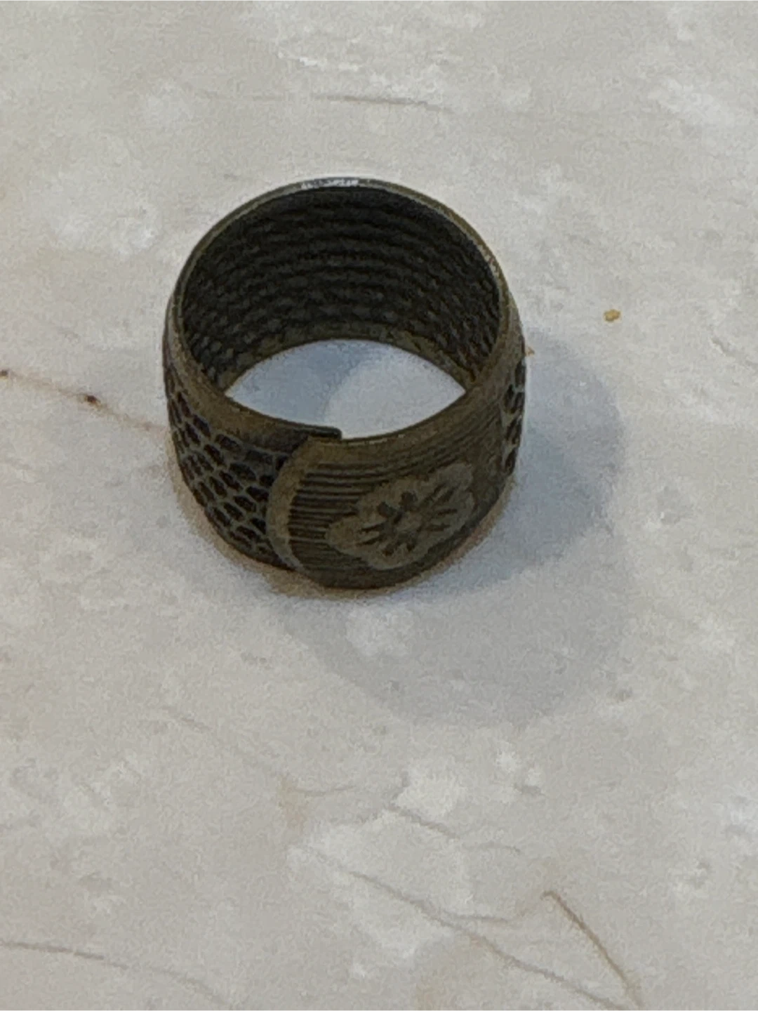 Selling a vintage metal thimble, perfect for sewing enthusiasts or collectors! It has a unique design and a lovely worn look