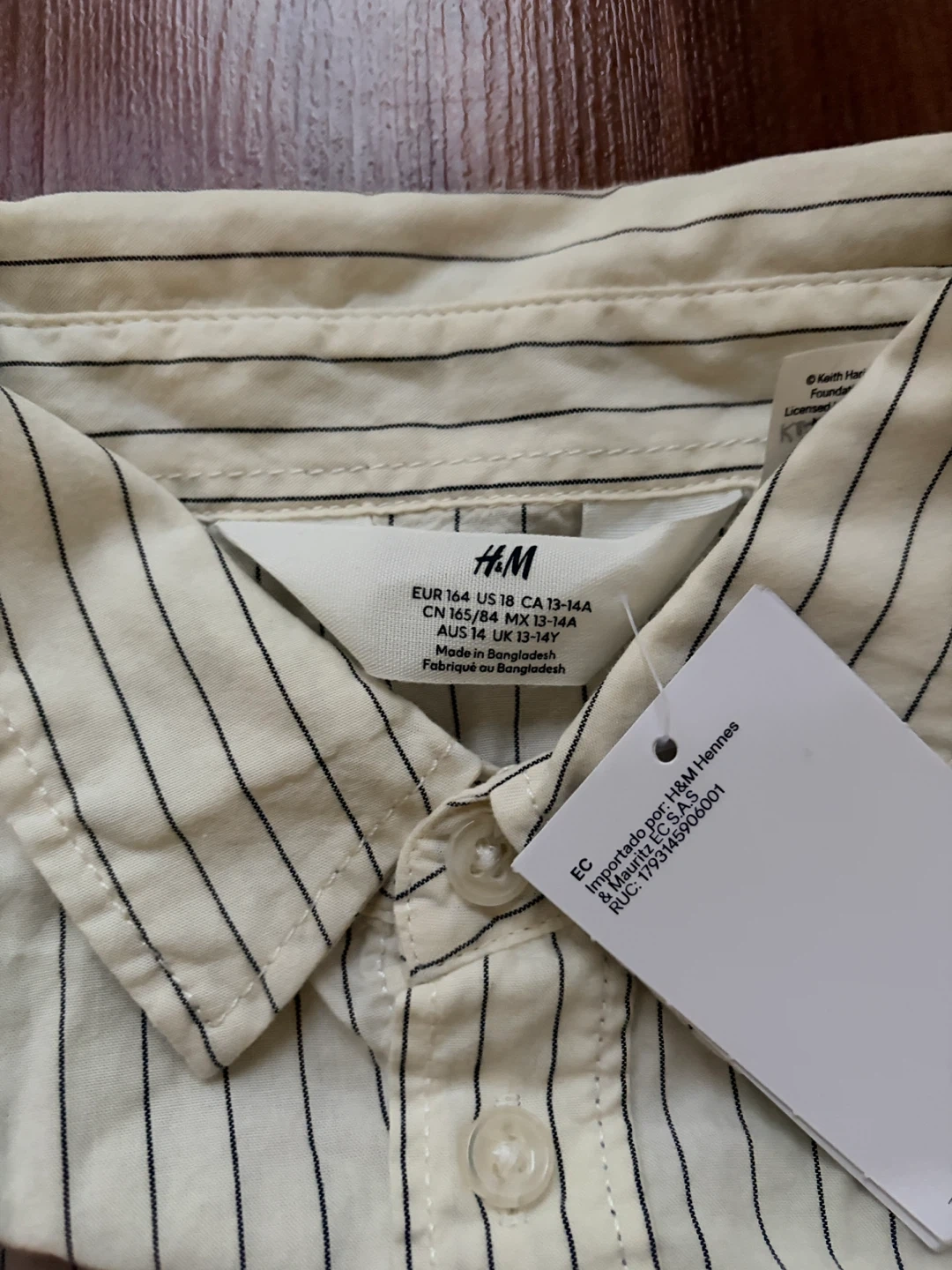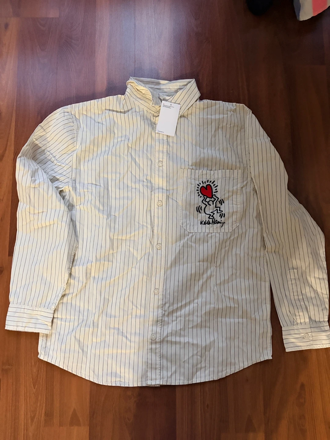 Selling an H&M button-up shirt with a Keith Haring design! It's a size 13-14 (EUR 164, US 18, CA 13-14A). The shirt has a stylish striped pattern and a cool embroidered heart graphic on the pocket. Perfect for adding a bit of art to your wardrobe!
