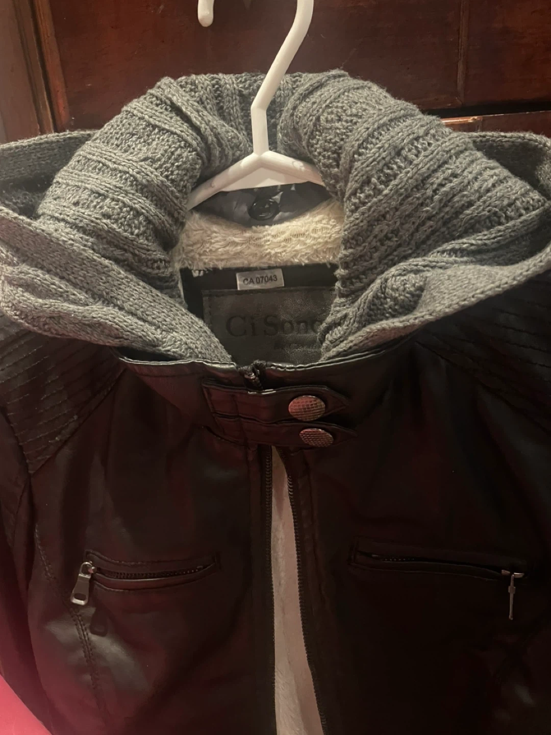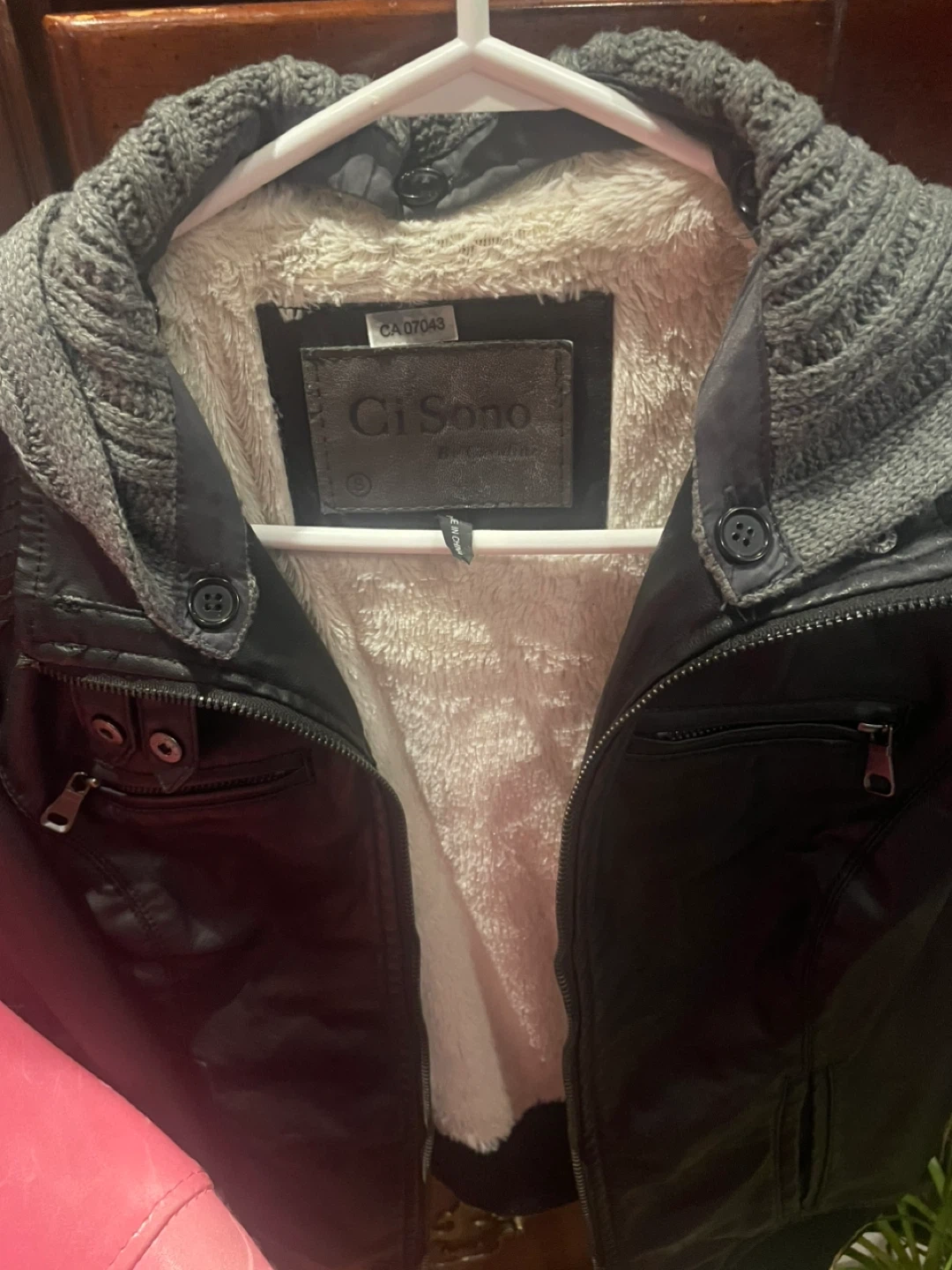 Here's a Ci Sono black faux leather jacket! It features a grey knit hood and a cozy, plush lining. Perfect for adding a bit of edge and warmth to your wardrobe.