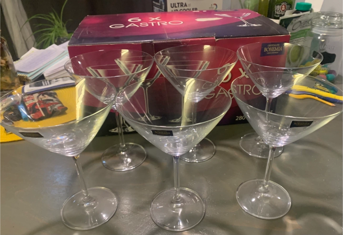 Selling a set of 6 Crystalite Bohemia Gastro martini glasses! They are in great condition and ready for your next cocktail night. Each glass holds 280 ml / 10 oz. The original box is included!