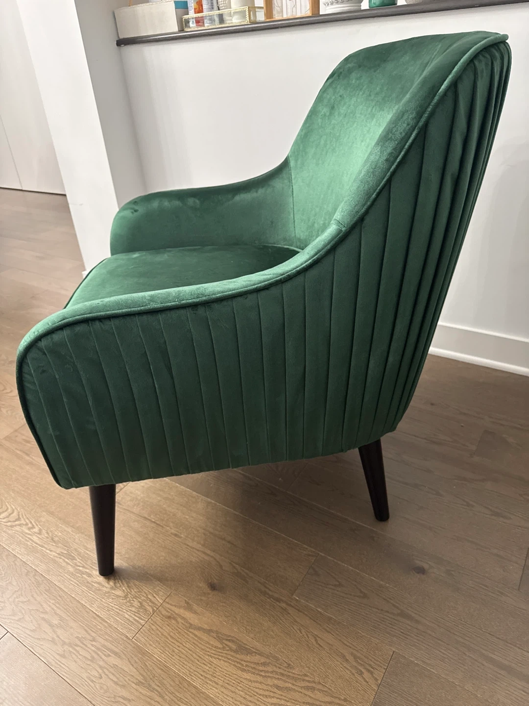 Selling a stylish green velvet accent chair! It's in great condition and would add a touch of elegance to any room. The velvet material is soft and comfortable, perfect for relaxing