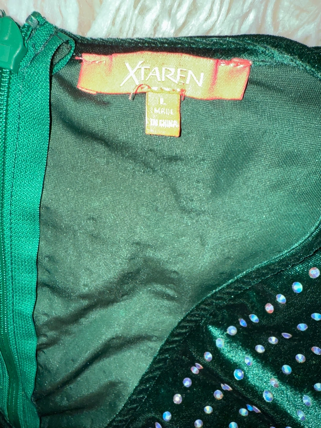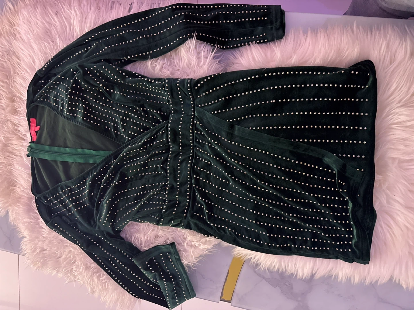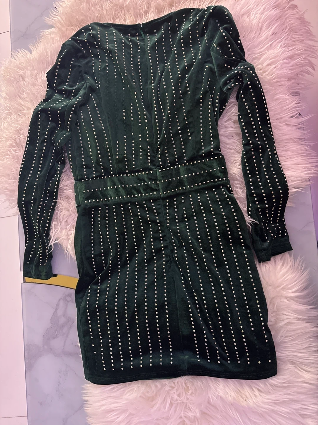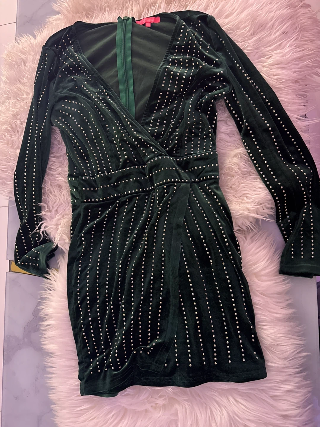 Selling a beautiful green velvet dress from Xtaren in size L. It features a flattering wrap style and is adorned with delicate studs. Perfect for a night out or special occasion!