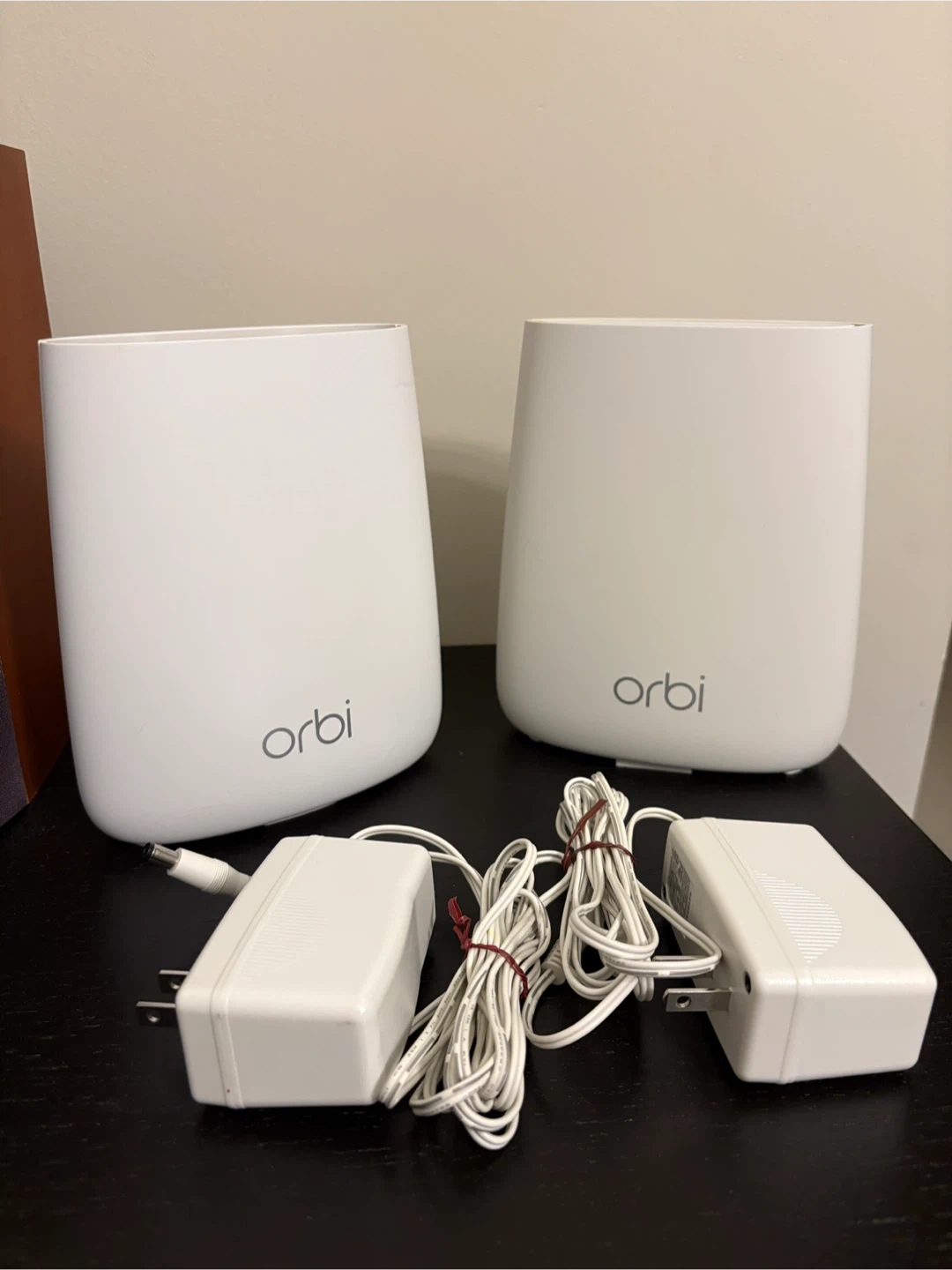Selling an Orbi Router RBR20 and Satellite RB52D. The included components are the router, satellite, and their chargers. Perfect for extending your WiFi coverage throughout your home!