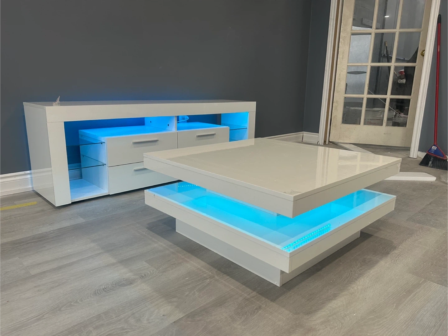 Selling a modern coffee table with built-in LED lighting! It's a great statement piece for any living room, and the LED lights add a fun, customizable touch. The condition is great, and it's ready to brighten up your space