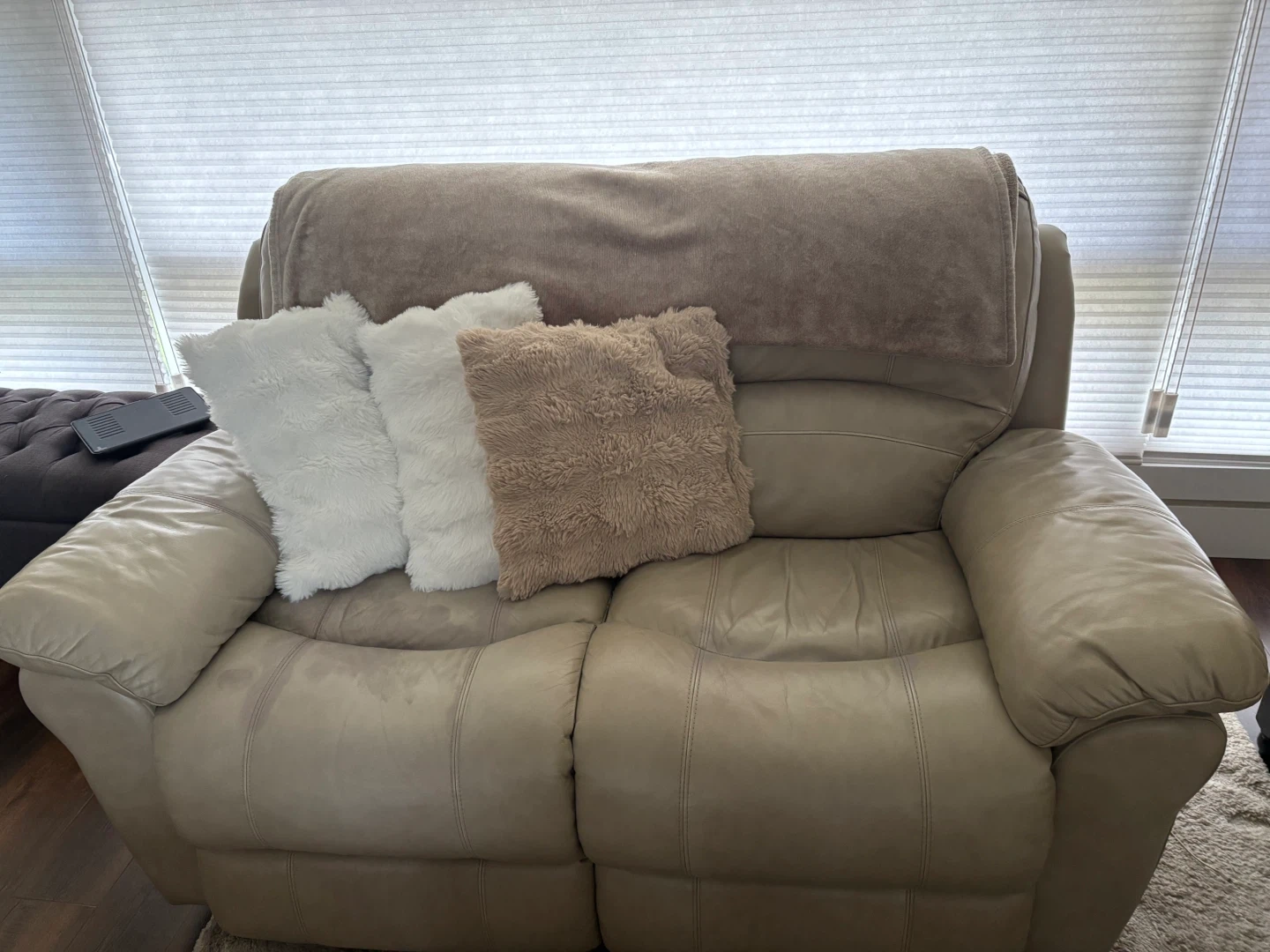 Beige leather power double recliner sofa. It has a convenient built-in USB port for phone charging, one on each side. There are some signs of discolouration as shown in photos.