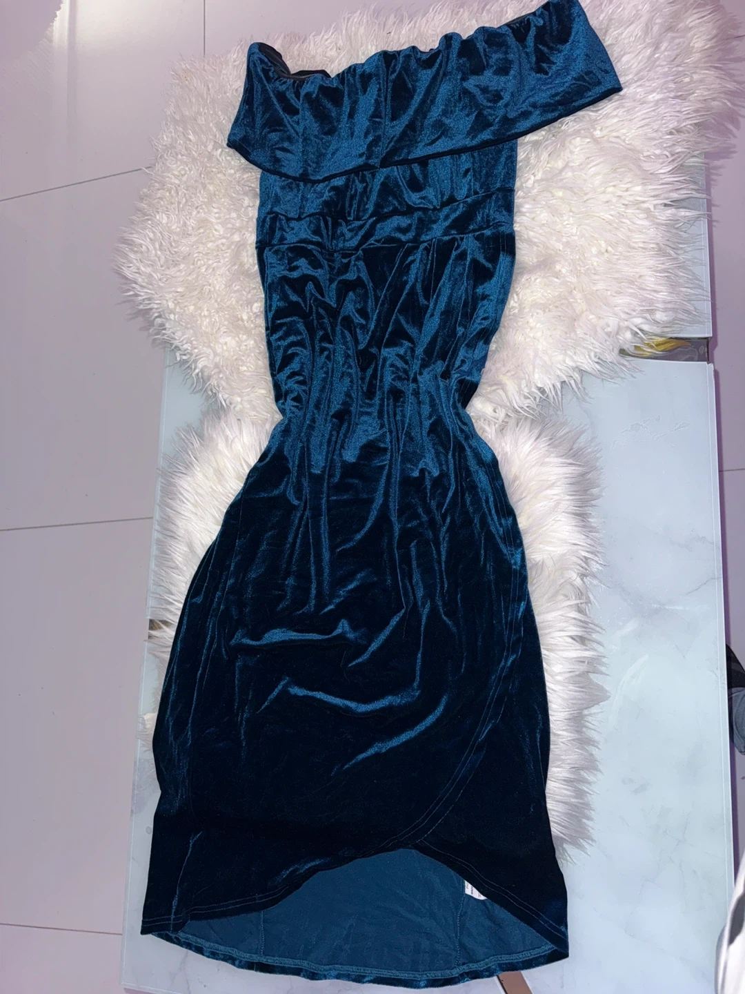 This is a beautiful blue velvet dress with an off-the-shoulder design. It's perfect for a night out or a special occasion. The dress is in great condition and ready for a new home